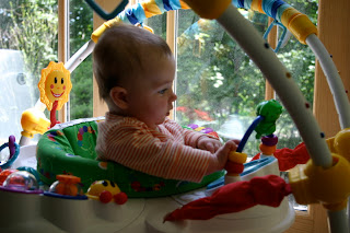 Here's abby's latest trick - hanging out in her doorway bouncer, she seems to like it so far. Today was Abby's first day with Maureen the daycare lady, I think she did ok. It was most likely more difficult for me than her. Maureen said she did great and I didn't cry at drop off, I did my crying last weekend when I was trying to choose between the daycare options.
